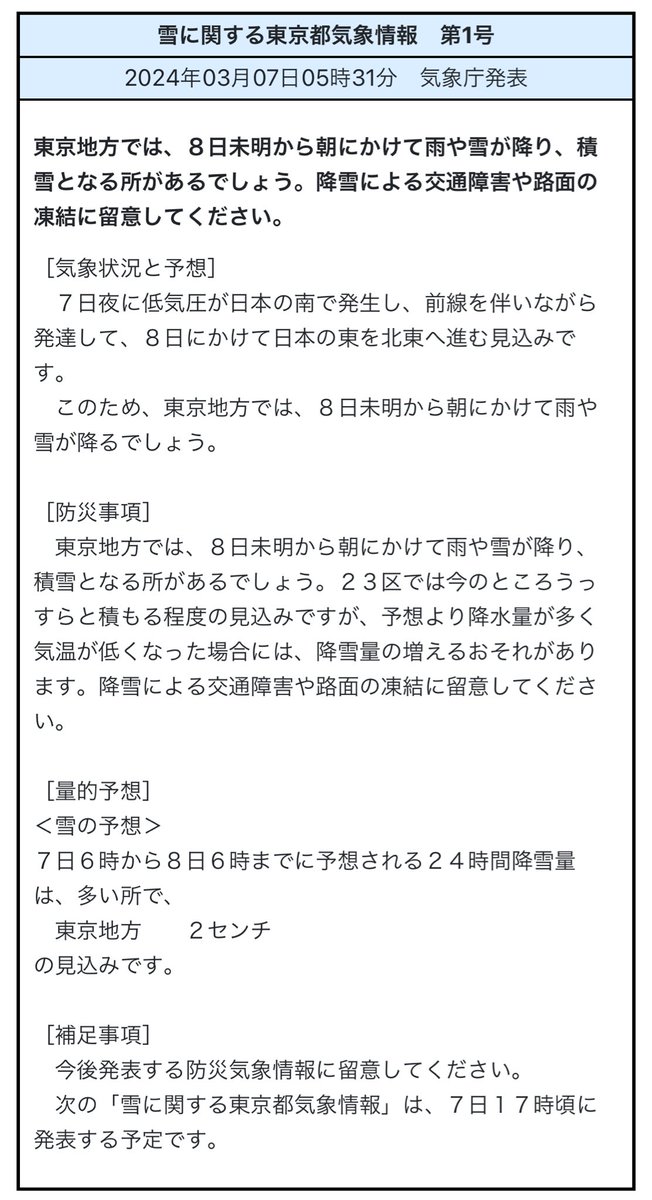 【雪に関する情報】〜東京23区では、うっすら積もる程度〜最新の気象情報によると、東京地方では明日(8日)未明から朝にかけて雨や雪が降り、23区では今のところうっすらと積もる程度の見込みです。予想より降..