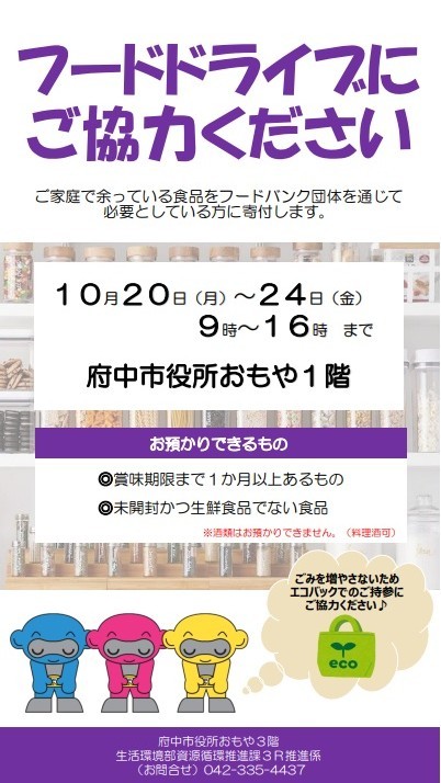 フードドライブを実施します〇10/20(月)~10/24(金)9時~16時〇府中市役所「おもや」1階※賞味期限が1か月以上ある未開封の食品。(生もの、調味料以外の酒類はお預かりできません。)みんなで食..