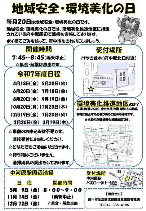 【10/20(月)7:45~府中駅周辺清掃の開催】市では、毎月20日を「地域安全・環境美化の日」として、けやき並木を中心に府中駅周辺の清掃活動を実施しています。事前申込み不要で、清掃用具の貸出しも行っ..