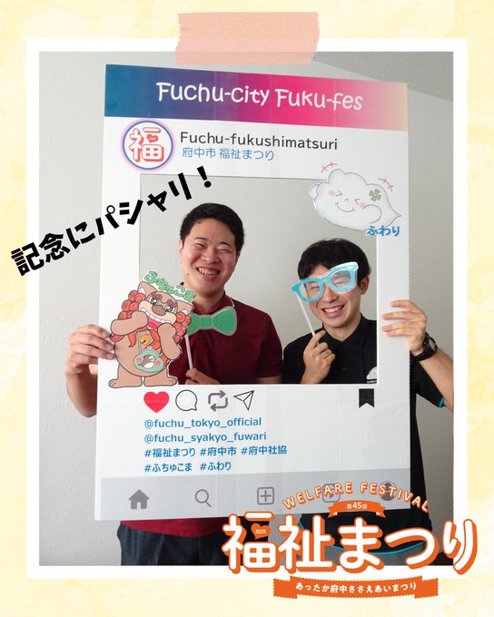 今週の日曜日は福祉まつりです!当日、会場にはSNSパネルを準備しています!ぜひ、記念に一枚パシャリ!撮影してくださいね♪この他にも撮影に使えるフォトプロップスもあります!#福祉まつり#府中市#府中市社..