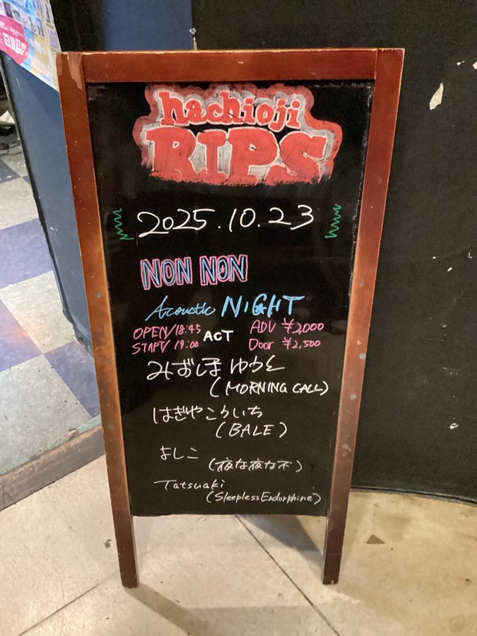 本日こちら!2025.10.23THUHachiojiRIPSNONNONACOUSTICNIGHTみずしまゆうと(MORNINGCALL)はぎやこういち(BALE)よしこ(夜な夜な不)Tatsuak..