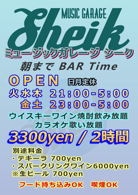 今週も宜しくお願い致します。今月より営業時間19:00-5:00。Butcherはフードラストオーダー23:00、ドリンクラストオーダー23:30とさせて頂いております。以降は隣"Sheik"にて飲み..