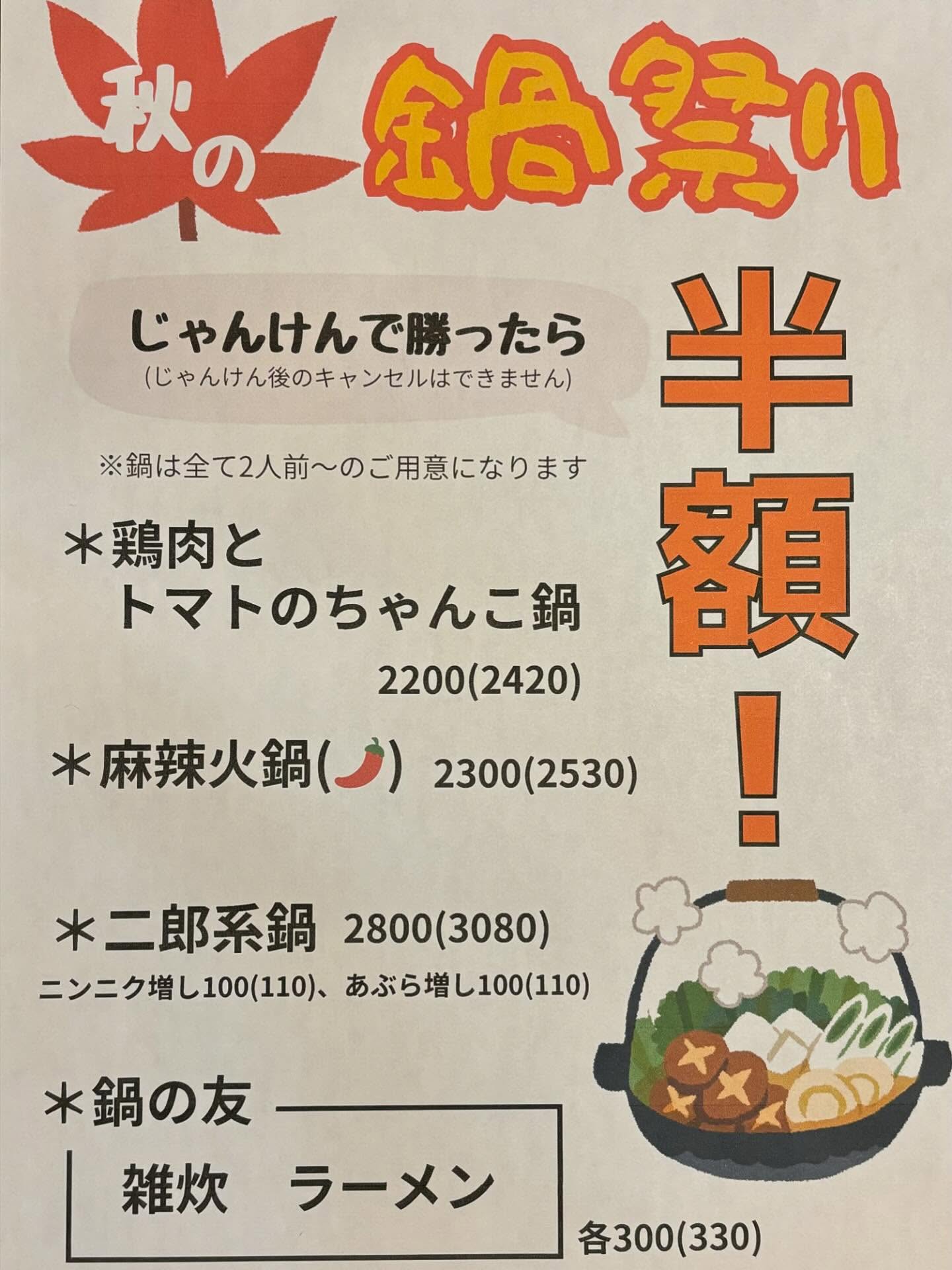 【イベントのお知らせ】10/14(火)〜10/28(火)の2週間限定でジャンケンに勝つとなんと『半額』に‼️『秋の鍋まつり』を開催します🍲✨️だんだんと肌寒くなってきました😖🍃寒くなってきた今の季節..