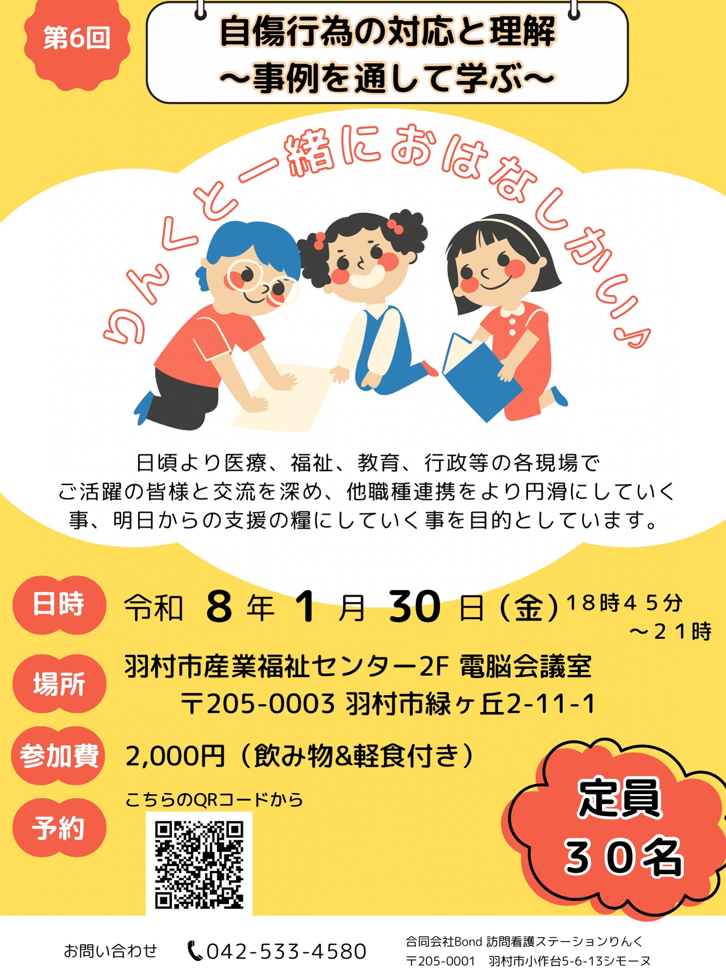 📖第6回勉強会のお知らせになります📖今回のテーマは「自傷行為の理解と対応〜事例を通して学ぶ〜」です。..