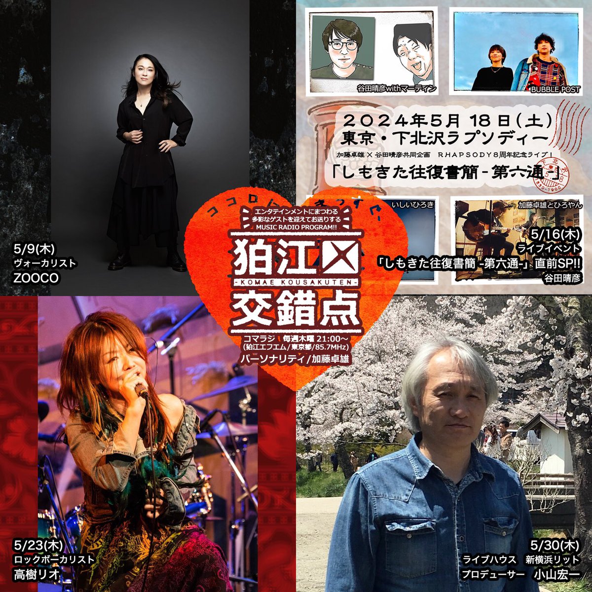 ▼狛江エフエム/コマラジ(東京都狛江市/85.7MHz)音楽情報番組♫#狛江交錯点♫パーソナリティ/加藤卓雄毎週木曜21時~生放送中‼️ゲスト5/9(木)ZOOCO5/16(木)谷田晴彦/しもきた往復..
