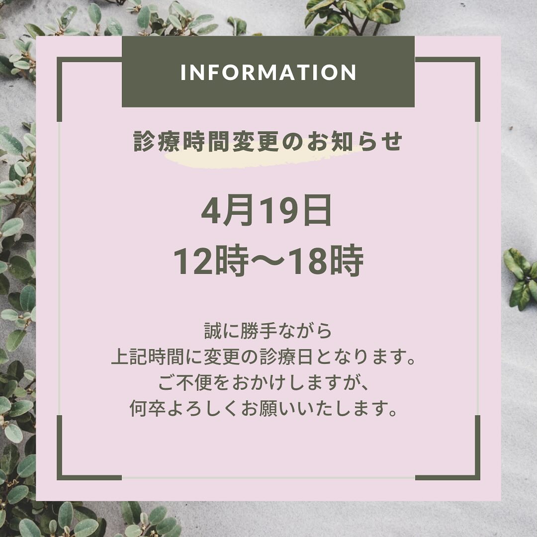 .いつもご覧いただきありがとうございます😊4月19日の診療時間変更のお知らせです🔈ご迷惑をおかけいたしま..