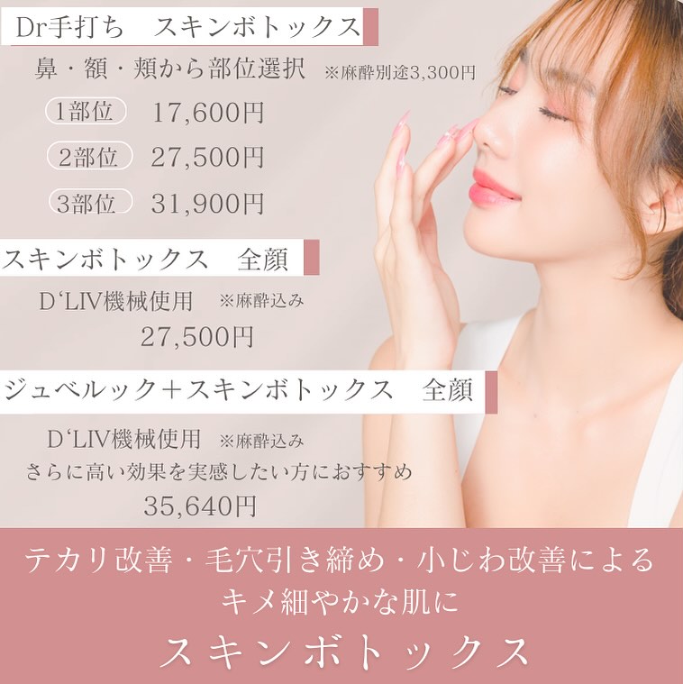 \小じわ・毛穴改善/スキンボトックスキャンペーン🌞スキンボトックスとは、皮膚の浅い部分にボトックスを細かく注入する施術です。自然な表情を保ちながら、毛穴の引き締めや肌質改善が可能です✨このようなお悩み..