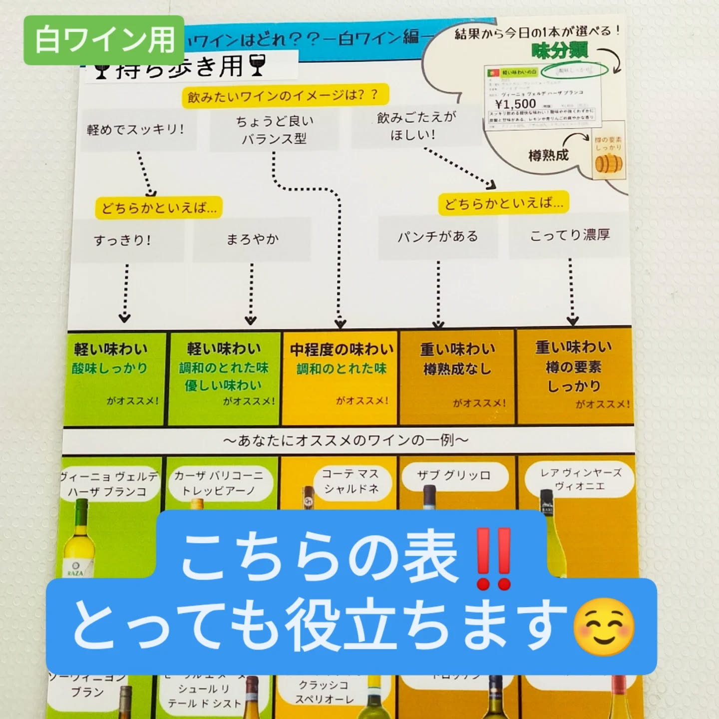 .皆さんこんにちは😊店頭スタッフのユミです!今日飲みたいワインをどう選ぼうかな??色々ありすぎて迷っちゃう💦そんな時には是非こちらの表をご活用下さい❗お客様の気分に合ったワインを選んでいただけます♪🍷..