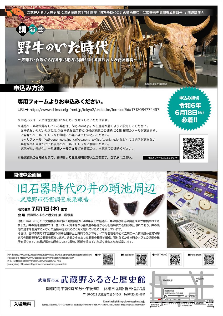 【企画展関連講演会】「野牛のいた時代 黒曜石・頁岩から探る東北地方北部における旧石器人の資源獲得」の参加者を募集中です。 一関市花泉遺跡の資料の紹介とともに東北北部を遊動した旧石器時代人の生活の一端をお話しします。 #武蔵野市 #博物館 #歴史 #考古 #文化財