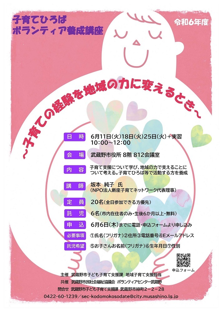 【受講者募集!子育てひろばボランティア養成講座】日程:6月11日(火)・18日(火)・25日(火)+実習時間:午前10時~正午申込:6月6日までに、電話または申込フォームlogoform.jp/for..