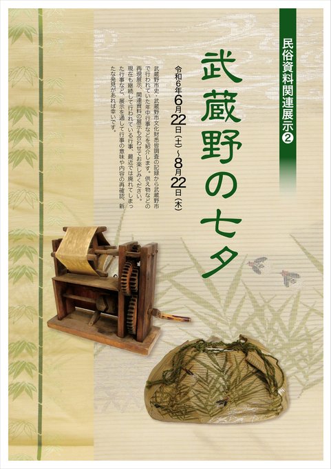 【特集展示】令和6年6月22日(土)から、令和6年度第2回特集展示「民俗資料関連展示[2]-武蔵野の七夕-」が始まります。本年度から再開した「民俗資料関連展示」では、武蔵野市の年中行事を市史や悉皆調査..
