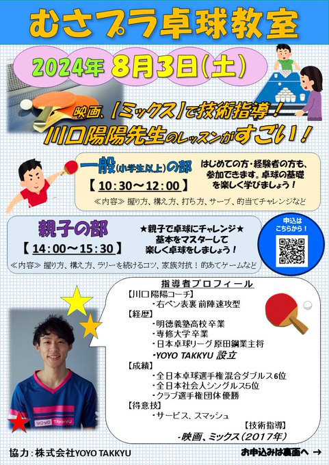 \#卓球教室in#むさプラ/今年も#映画「#ミックス」で技術指導を行った#川口陽陽先生をお招きし、卓球教室を開催!第1回は8月3日(土)!!みんなで#卓球をしようお申込み等、詳細はコチラhttps:/..