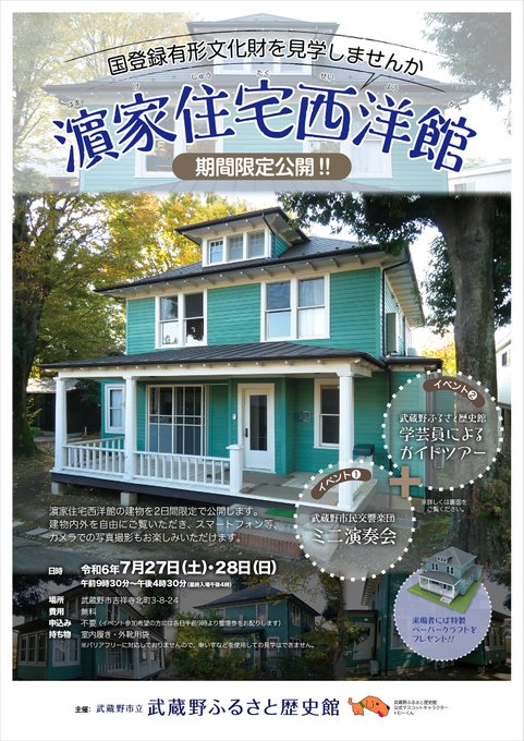 【濱家住宅西洋館2日間限定公開】国登録登録有形文化財を見学しませんか建物内外を自由に見学、写真撮影もOK。ミニ演奏会・当館学芸員によるガイドツアーも開催。ペーパークラフトのお土産つき!!日程:令和6年..
