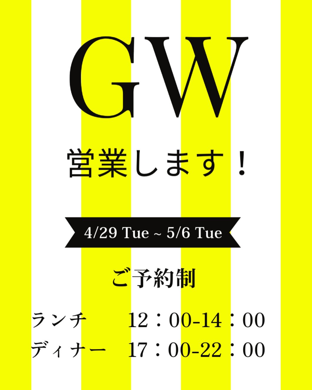 _GW(祝月)も含め営業いたします!!ランチ12:00openディナー17:00openです!※お客様へご予約の際、お子様のご来店をお断りをしておりませんが、お席に限りがありますので、お子様の人数、ベ..