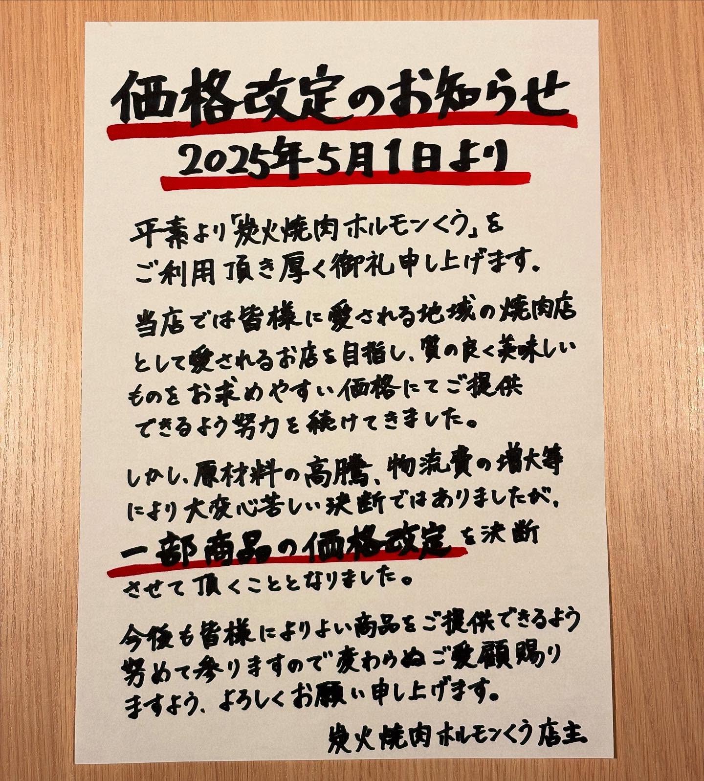 【お知らせ】いつも炭火焼肉ホルモンくうをご利用いただき、誠にありがとうございます。このたび、2025年5月1日より価格改定を一部メニューの価格を改定させていただくこととなりました。今後も皆さまにご満足..