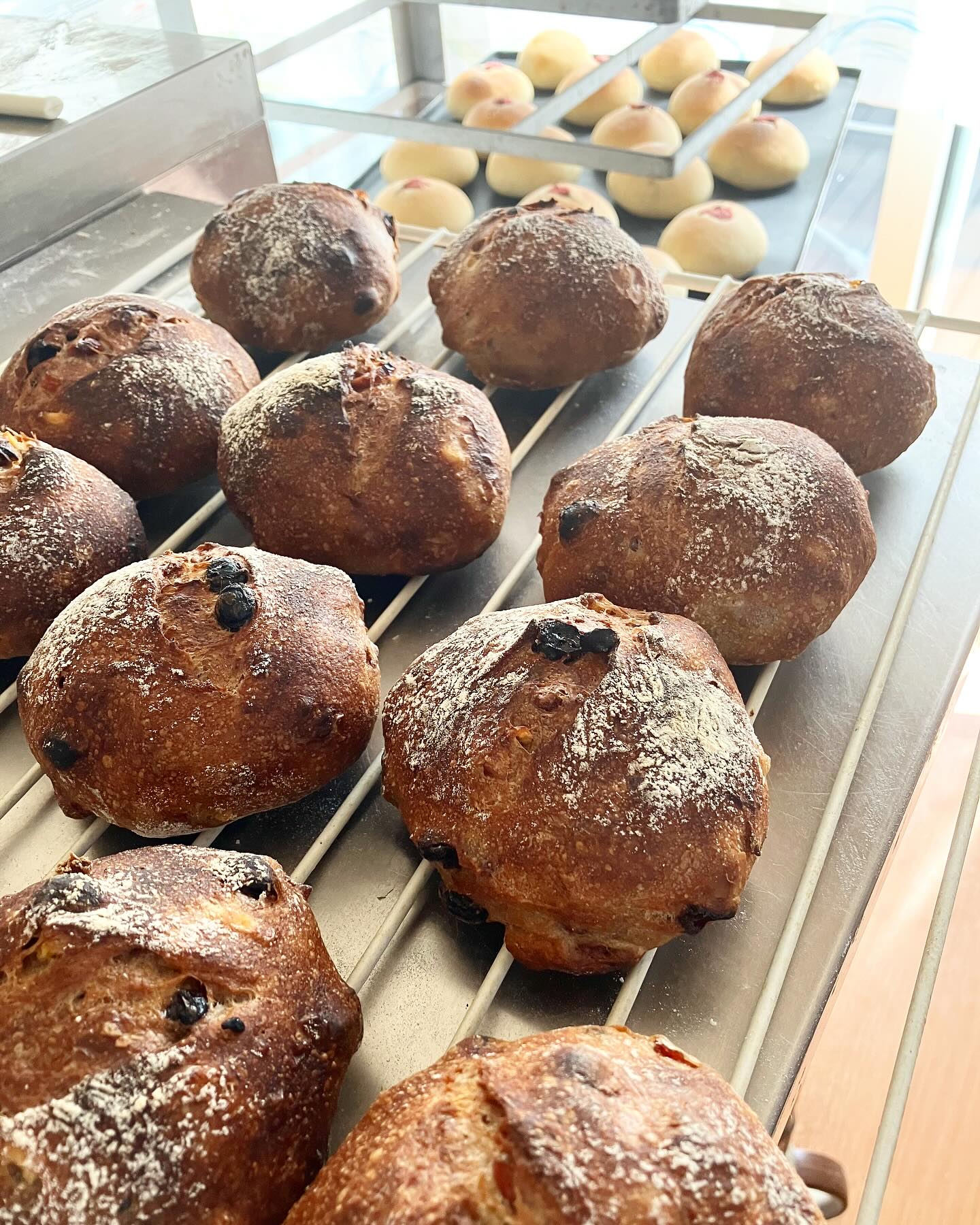 明日4/19(土)営業します!明日はちょっと暑くなりそうです。今からこんなに暑いと先が思いやられる感じですね…写真はフルーツカンパーニュ。レーズンから起こした酵母で焼いてます。有機レーズン、クランベリ..