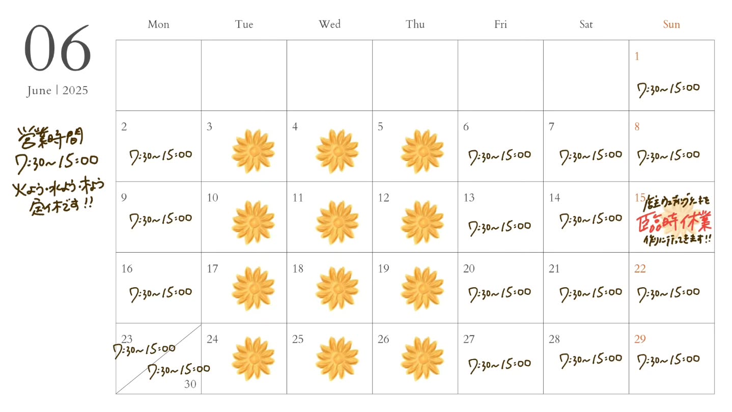 【6月の営業日程のお知らせ】6月は15日の日曜日、結婚式のウェディングケーキを作りに行く為お店は臨時休..