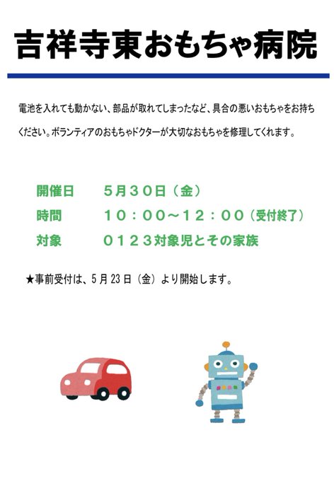 5月30日(金)は「吉祥寺東おもちゃ病院」の日です。それに伴い、事前受付も開始しています。詳しくは、下記のポスターをご覧ください。