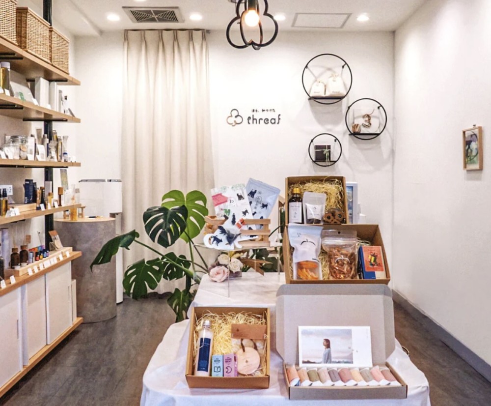 threaF(スリーフ)というお店の名前は「3」という「満つる」や「充つる」につながる縁起の良い数字と、「leaf」はナチュラル、健康なイメージの商品を扱うことから由来している。
