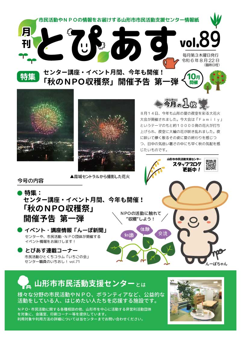 【とぴあすvol.89発行しました】昨年度開催した「プライムタイム」を、今年度は講座・イベント月間として10月に開催します!今号ではその情報をちらっとお届けします!#市民活動#NPO下記URLよりご覧..