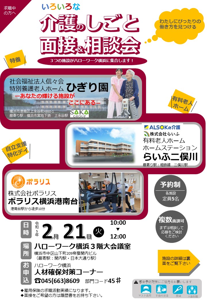 受付中いろいろな介護のしごと面接&相談会2/21(火)午前@ハローワーク横浜3階大会議室いろいろなサービス形態の介護事業所と面談できます。面接はもちろん、情報収集や相談だけでもOK!お気軽にお問合せく..