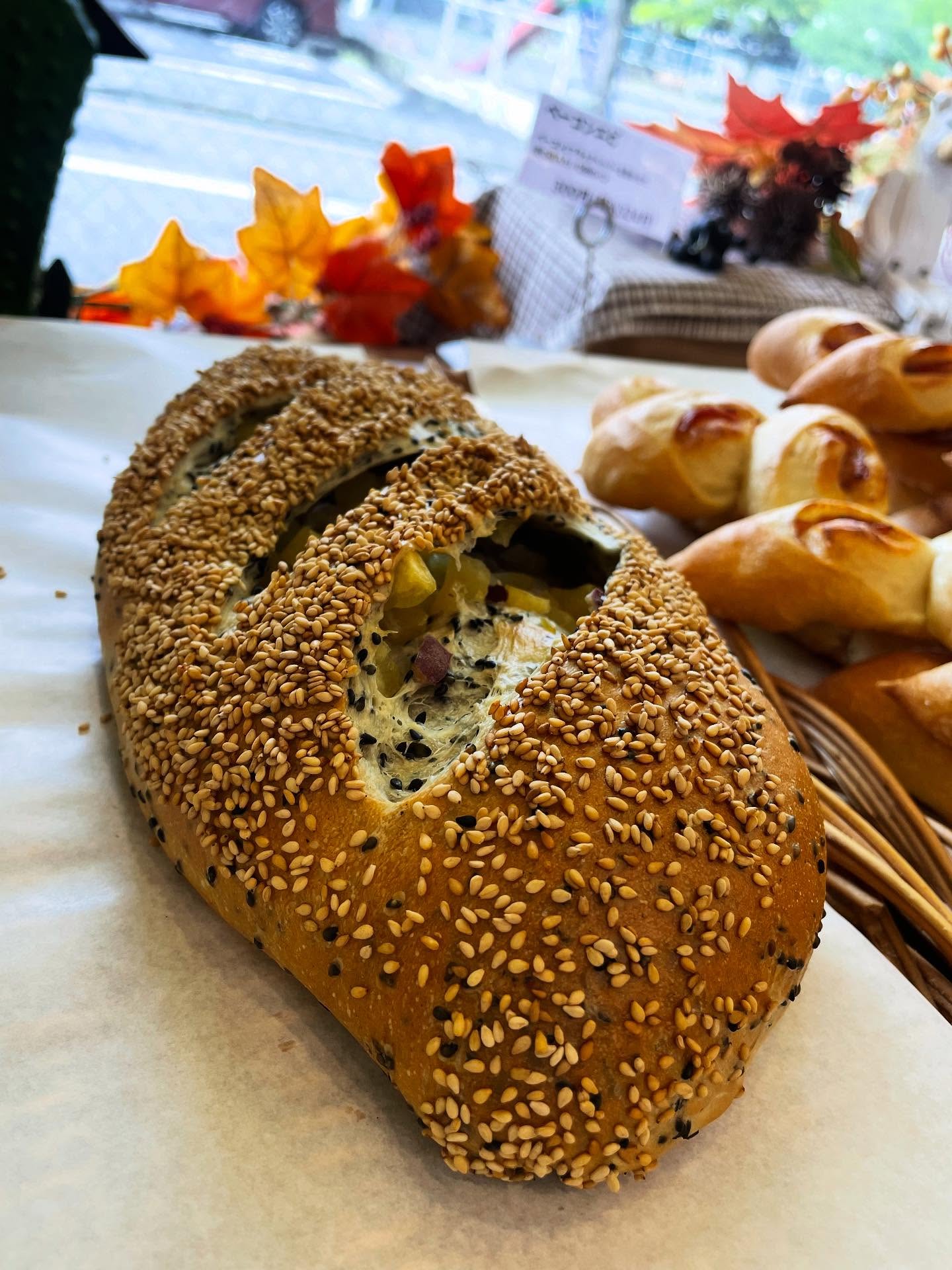 海辺のパン屋ブレーメンです。秋になり、おさつフランス人気です♪ごまパンにダイス..