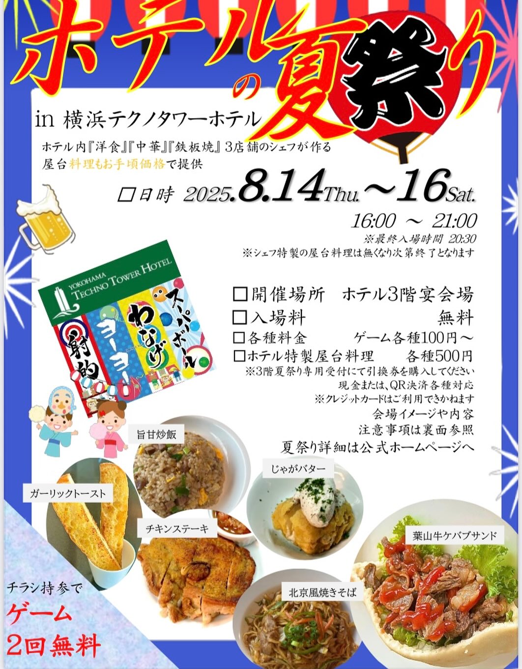 こんにちは リューバンカフェです(^^)この暑さ💦ヤバいですね😨テクノタワーホテルでは、夏祭りを開催いたします🏮涼しい室内で、美味しい食べ物、ゲーム、盆踊りなど楽しんでいただけたらと思います!詳しくは..