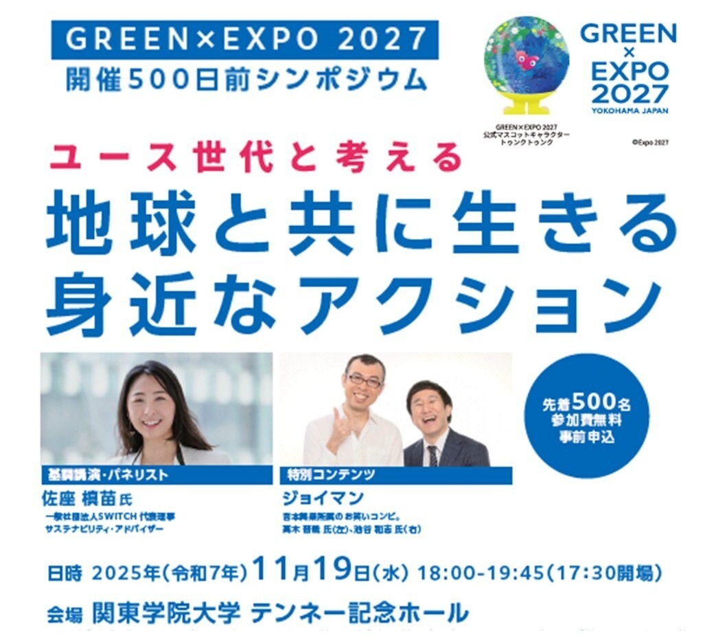 / あなたの行動が地球を救う一歩に!? ユース世代と考える GREEN×EXPO 2027 開催500日前シンポジウム \ テーマは 「地球と共に生きる身近なアクション」 11/19(水)18:00開演 関東学院大学 テンネー記念ホール 先着500名・参加無料 申込は▼ https://ge500symposium.city.yokohama.lg.jp/@exa-group-XSjrH8ZGCTBfrY7G1mpc… #横浜