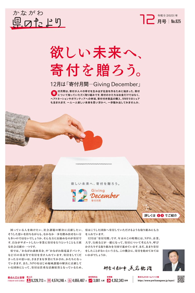 【県のたより12月号】1面は、「欲しい未来へ、寄付を贈ろう。」です。ホームページ版(www.pref.kanagawa.jp/tayori/..)では、PDF版も掲載しています。なお、新聞折込地域は、..