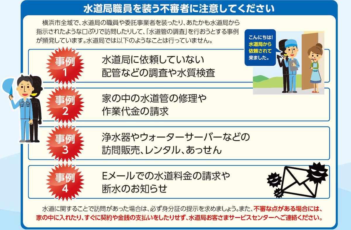 ⚠不審者情報⚠ #港北区 で不審者情報が頻発しています 訪問者には身分証の提示を求めてください ①日・場所 11/29 港北区 ②概要 水道局の委託事業者や下請け事業者と言い、水道管の点検をするという訪問があった #横浜 #水道🚰