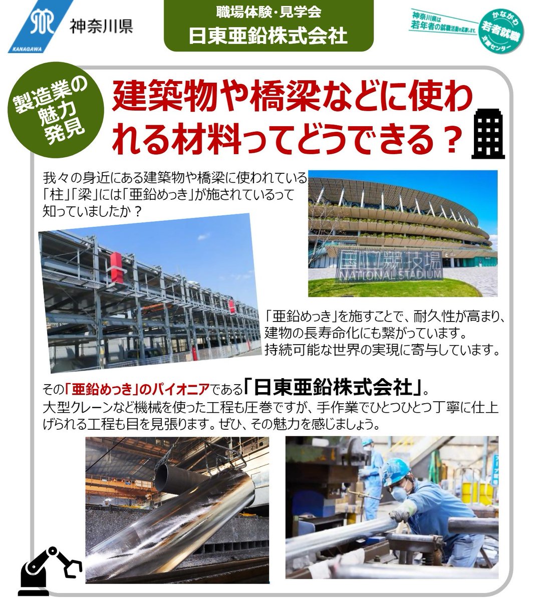 【かながわ若者就職支援センター】12月18日(月)13:45~16:30は、日東亜鉛㈱(川崎市川崎区水江町)で「職場体験・見学会」を開催!工場見学、めっき作業や製品チェックの体験、企業の方と座談会を実..