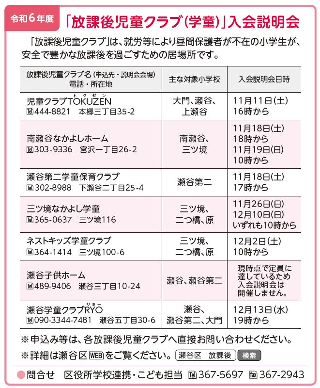 【令和6年度「放課後児童クラブ(学童)」入会説明会】入会説明会の開催日時を瀬谷区WEBでご案内しています。▼入会説明会実施クラブ児童クラブTOKUZEN、南瀬谷なかよしホーム、瀬谷第二学童保育クラブ、..