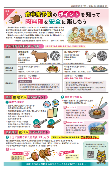 【食中毒予防のパネル展を開催します!】日時8月8日(金)~22日(金)場所区役所区民ホール夏はバーベキューなどで肉を調理する機会が多くなります。肉を原因とする食中毒の予防のポイントを知り、肉料理を安全..