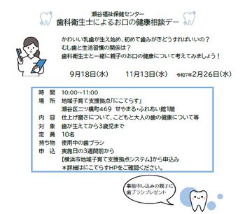 【申込受付中☆お口の健康相談デー】歯が生え始め~3歳児までのお子さん向けに、お口の健康相談デーを開催します!日時9月18日(水)10時~11時会場地域子育て支援拠点にこてらす定員先着10組申込み横浜市..