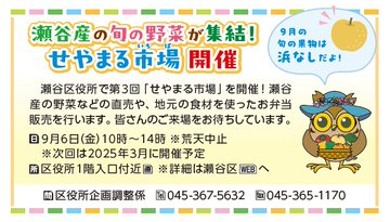 【瀬谷産の旬の野菜が集結!せやまる市場を開催します】瀬谷産の野菜の直売や、地元の食材を使ったお弁当販売を行います9月のせやまる市場:9月6日(金)10時~14時、区役所1階入口付近次回は2025年3月..