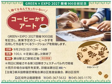 【捨てるなんてもったいない!コーヒーかすアートを作ろう】GREEN×EXPO2027開催900日前を記念して、コーヒーかすアートのワークショップを開催します!日時:9/2910時~16時会場:瀬谷駅駅..