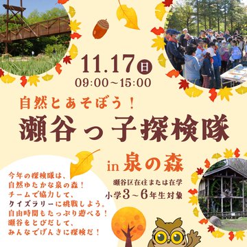 【自然とあそぼう!瀬谷っ子探検隊2024】今年の探検隊は、自然ゆたかな泉の森チームで協力して、クイズラリーに挑戦しよう。瀬谷をとびだして、みんなで元気に探検だ!対象:瀬谷区在住・在学の小学3~6年生申..