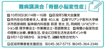 【難病講演会のご案内脊髄小脳変性症】病気の理解と治療、療養生活などについて医師等がお話しします。日時:10月9日(水)14時~16時会場:区役所5階大会議室対象:市内在住の患者本人、家族40人(先着)..