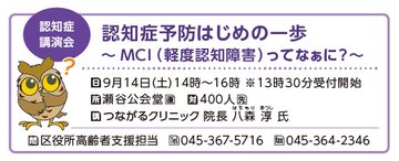 【認知症講演会のご案内認知症予防はじめの一歩】認知症の一歩手前の状態とされる軽度認知障害(MCI)について医師がお話しします。(申込不要)日時:9/14(土)14時~16時※受付:13時30分から会場..
