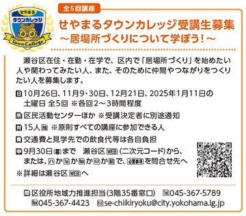 【せやまるタウンカレッジで「居場所づくり」を学ぼう】区内で居場所づくりを始めたい人、関わってみたい人を大募集!第1回:10/26(土)※全5回対象:区内在住・在勤・在学者15人(抽選)申込み:9/30..