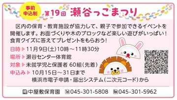 【瀬谷っこまつりに遊びにいこう】未就学児と保護者向けに、区内の保育・教育施設による#親子イベントを開催お面づくりや木のブロックなどで楽しく遊ぼう♪日時:11/9(土)10時~11時30分会場:瀬谷セン..