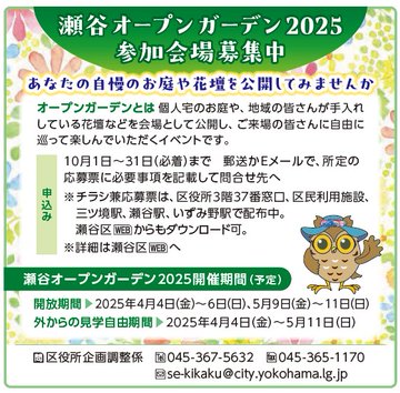 【瀬谷オープンガーデン2025参加会場募集】個人宅のお庭や、地域の花壇などを会場として紹介し、自由に巡って楽しんでいただくイベント「オープンガーデン」の参加会場を募集します開催期間や申込方法等の詳細は..