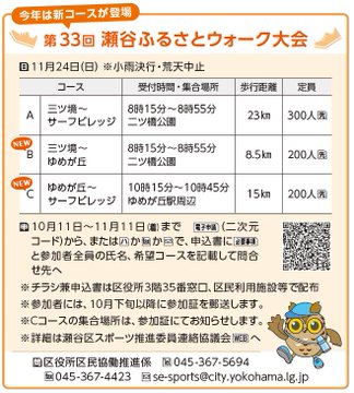 【瀬谷ふるさとウォーク大会参加者募集】今年は新コースが登場!県立湘南海岸公園サーフビレッジやゆめが丘を目指してみんなで歩こう♪(各コース定員あり・先着順)開催日時11月24日(日)申込11月11日ま..