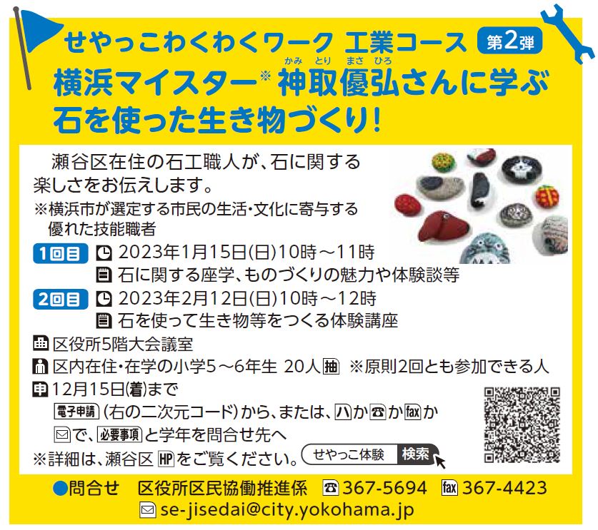 【せやっこわくわくワーク工業コース】石工職人の横浜マイスター神取優弘さんが、石を使った生き物づくりなど、石に触れる楽しさをお伝えします!実施日:2023年1月15日(日)、2月12日(日)対象:瀬谷区..