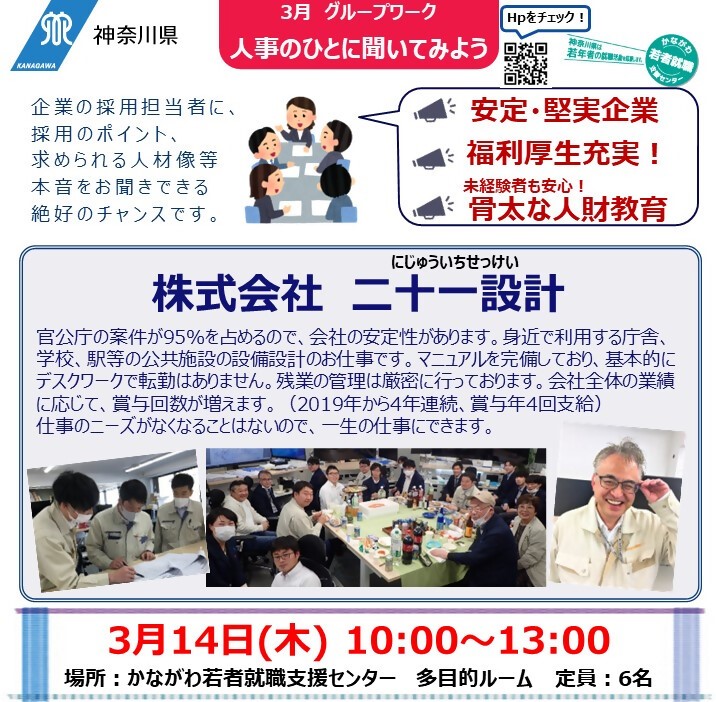 【かながわ若者就職支援センター】3/14(木)10~13時は、㈱二十一設計にご参加いただき「人事のひとに聞いてみよう」を開催!身近で利用する庁舎、学校、駅等の公共施設の設備設計を行っている企業です。w..
