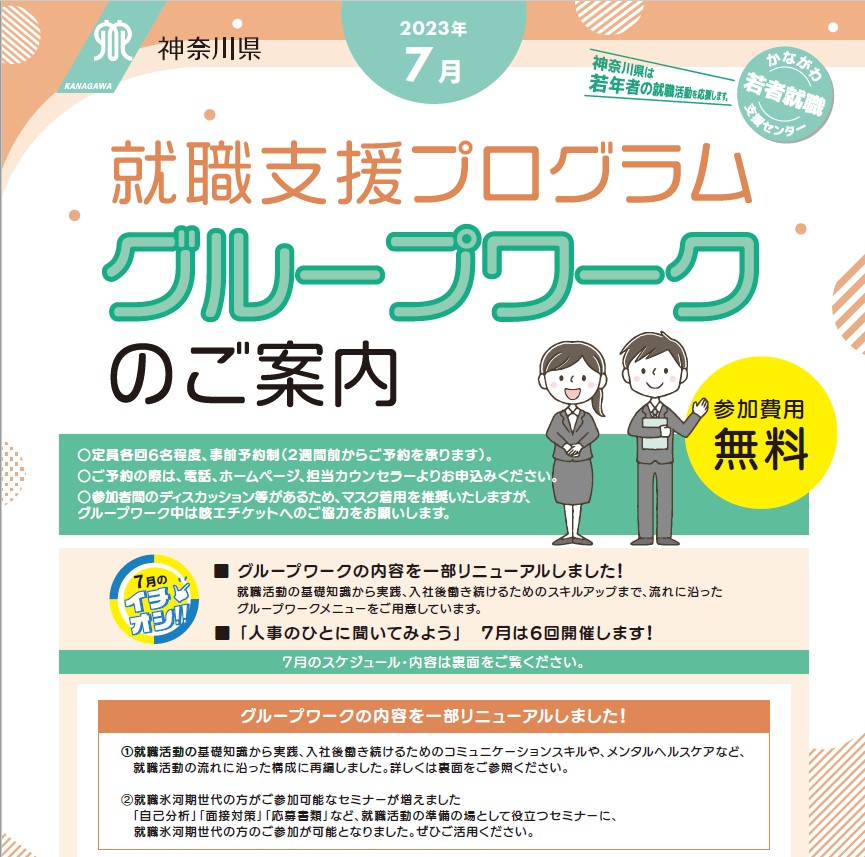 【かながわ若者就職支援センター】7月のグループワークスケジュールが決定!メニューを大幅リニューアル!就活の基礎知識から実践、入社後のスキルアップまで流れに沿ってお伝えします。www.kanagawa-..