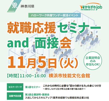 11/5火)は、ワンデー就活イベント「就職応援セミナーand面接会」を横浜市技能文化会館で開催します!就活力・就職マインドがアップするセミナーと10社規模の面接会を実施!企業説明のみ参加でもOK!参加..