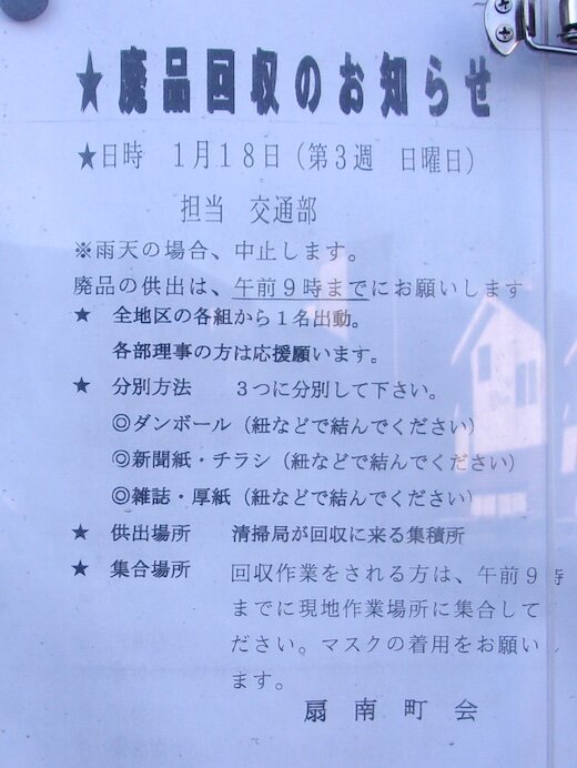 廃品回収のお知らせ 日時:令和8年1月18日(第3週 日曜日) 担当:交通部※雨天の場合中止いたします。