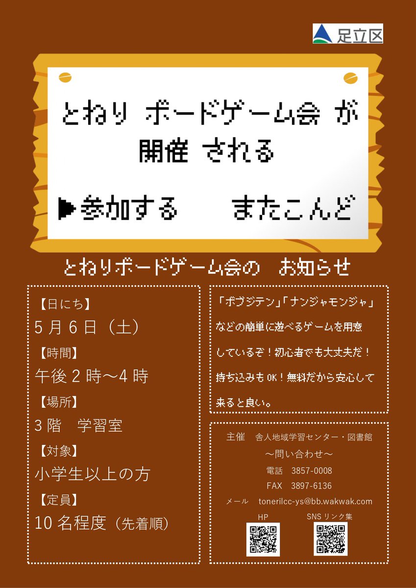 5/6(土)に #とねりボードゲーム会 を開催します!