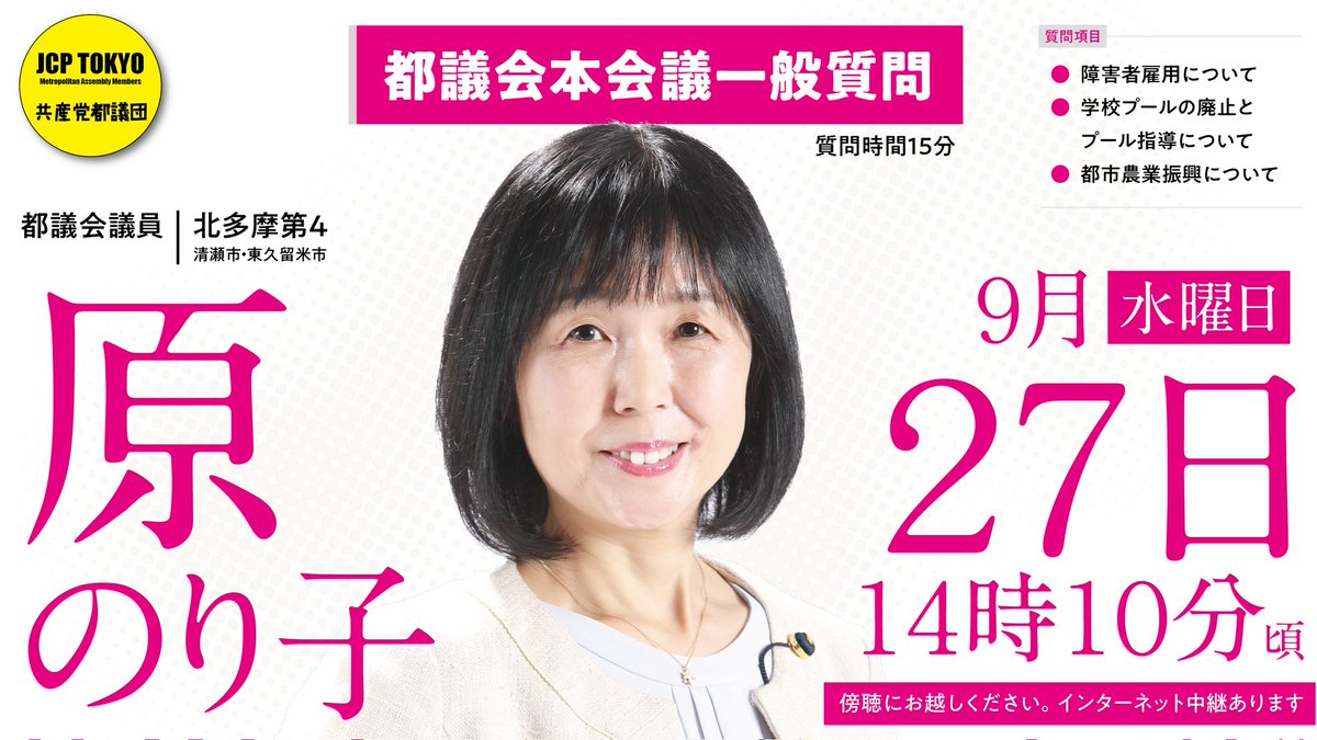 明日27日はこちら! 都議会・一般質問✩ 原のり子都議(北多摩第4選出)が質問します✨ 🍇障害者雇用について 🍎学校プールの廃止と プール指導について 🍐都市農業振興について 重要なテーマについて、迫ります! 14時10分くらいから😊 ぜひご視聴&傍聴にお越しください✨ #日本共産党都議団